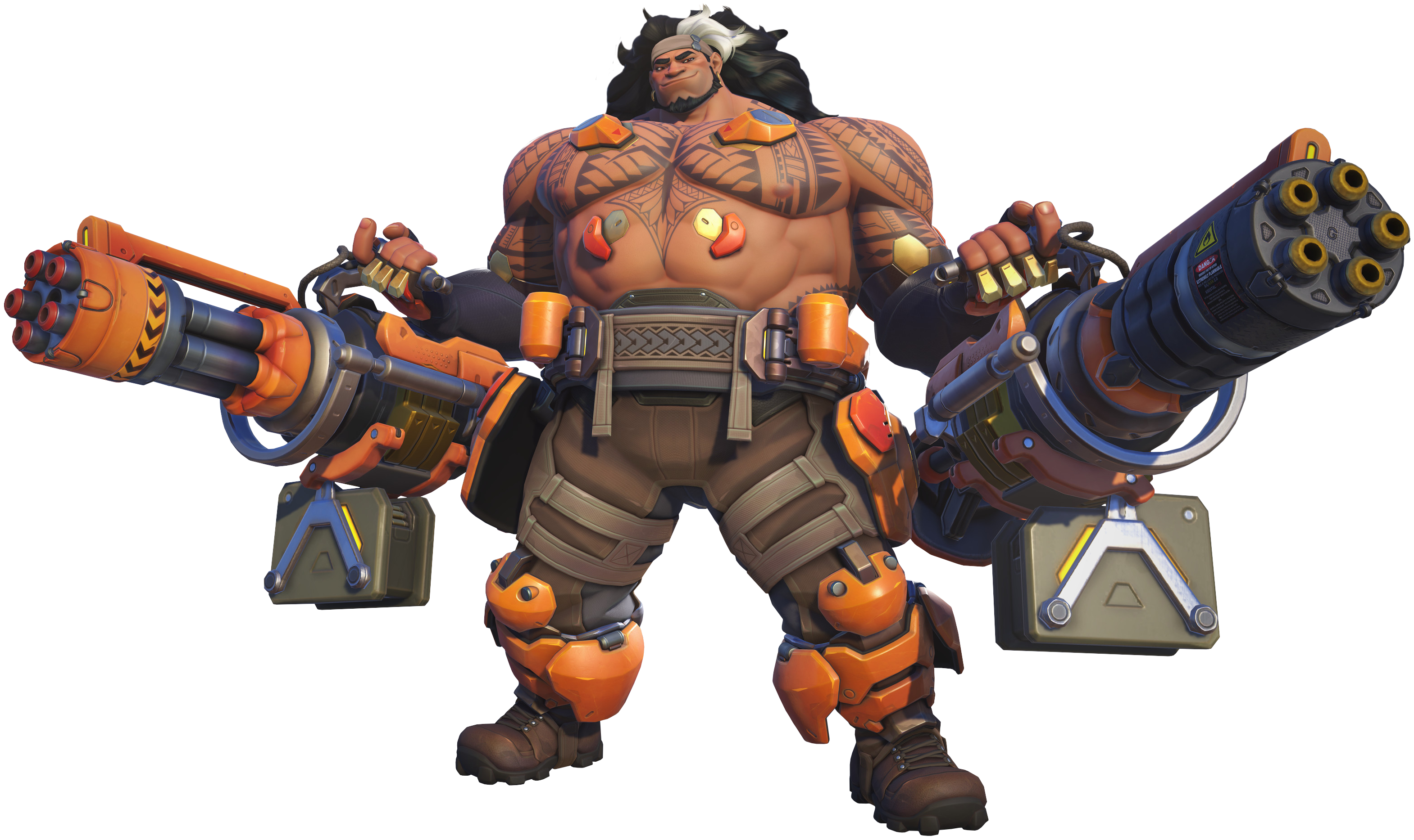 Mauga features a kit that is designed to bash through the front lines and brawl his opponents in close-quarter combat, by wielding two powerful chainguns that can either be fired individually or in unison. Ignite enemies with his incendiary chaingun “Gunny” to burn them when they take enough damage, then finish them with a critical hit from his volatile chaingun “Cha-Cha.” Paired with his Berserker passive, which grants Mauga temporary health whenever he deals critical damage, he’s a mountain on the battlefield.[3]
