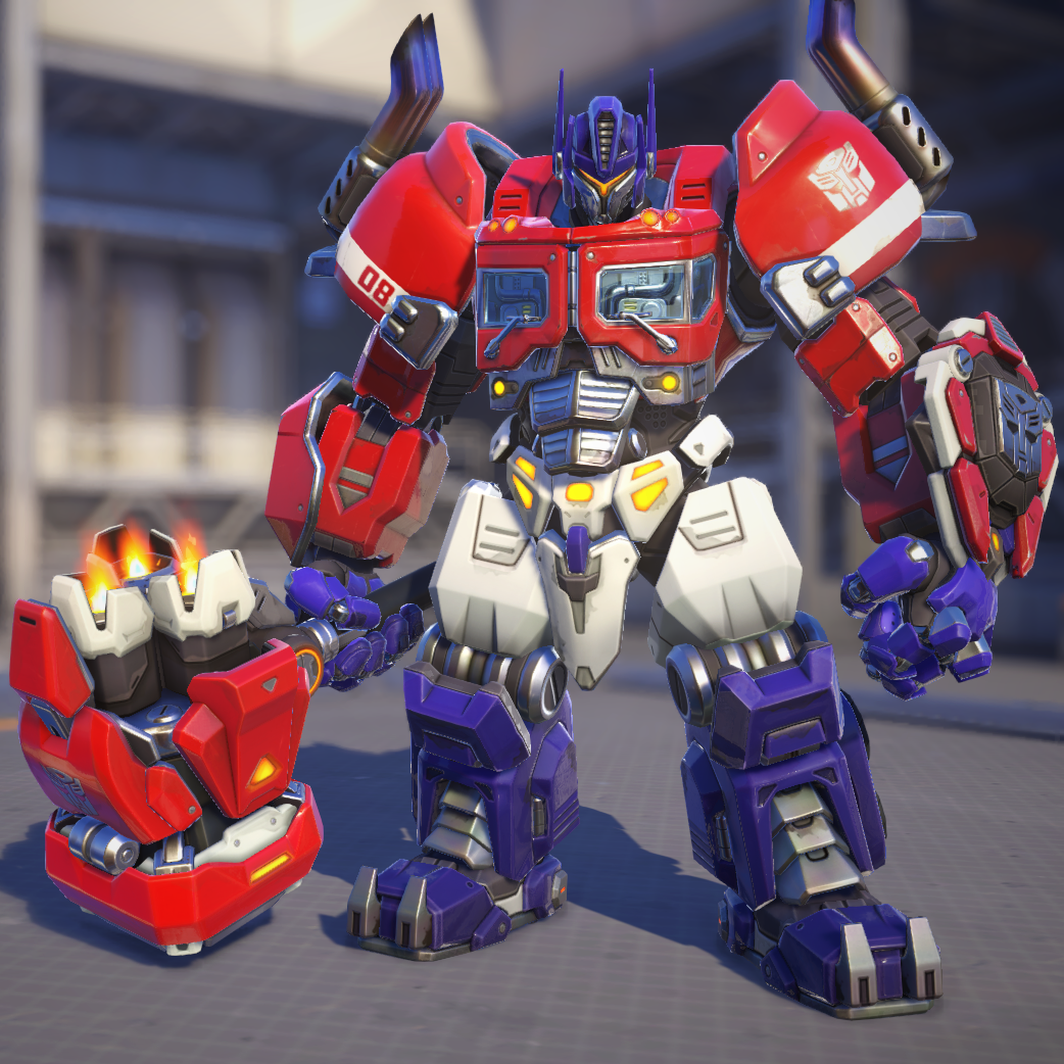 While Optimus wields an axe in some continuities, the developers had Reinhardt keep his hammer, as they needed familiar Overwatch elements to stay consistent. There was an idea for Optimus Reinhardt to change into his truck form when charging, but the idea was dropped.[2]